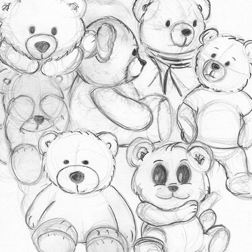 These illustrations showcase a refined graphite pencil technique that balances expressive line work with controlled tonal rendering, combining bold, high-contrast shading and soft gradient transitions to create depth, texture, and atmosphere across both portraiture and sketch studies; the portraits emphasize dramatic value range, stylized features, and confident mark-making, particularly in the hair, eyes, and fabric, while the teddy bear studies demonstrate a looser, exploratory approach with visible construction lines, light gestural strokes, and subtle form-building that highlights an understanding of volume, proportion, and character through iterative sketching.