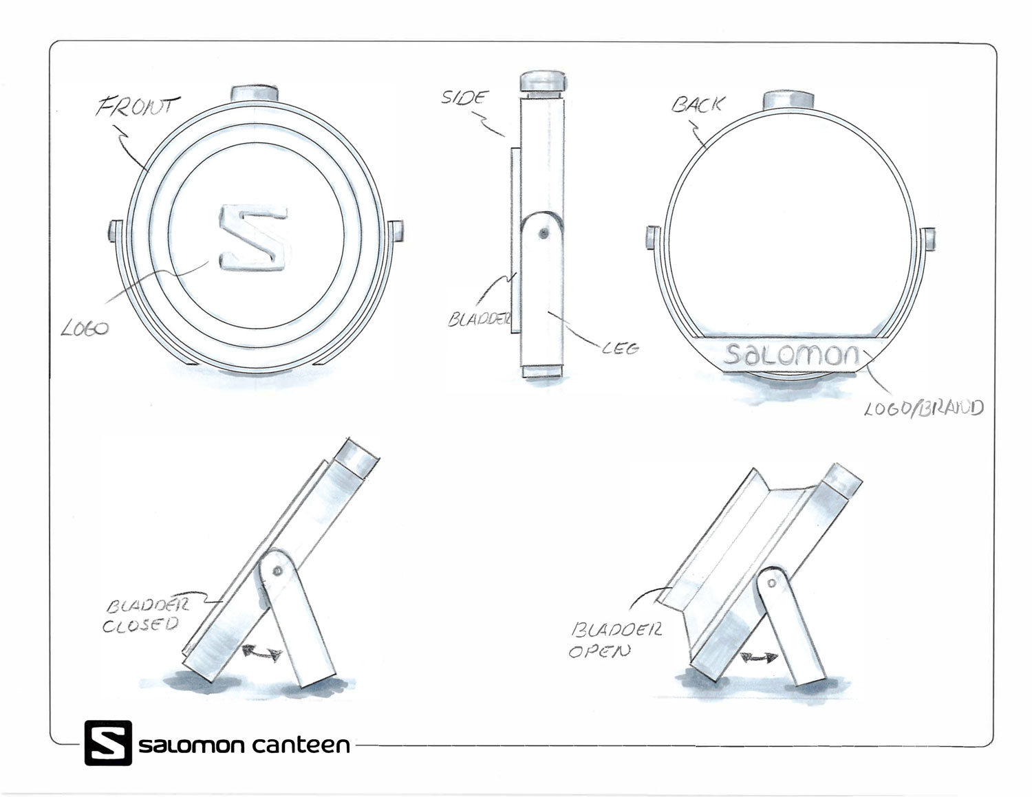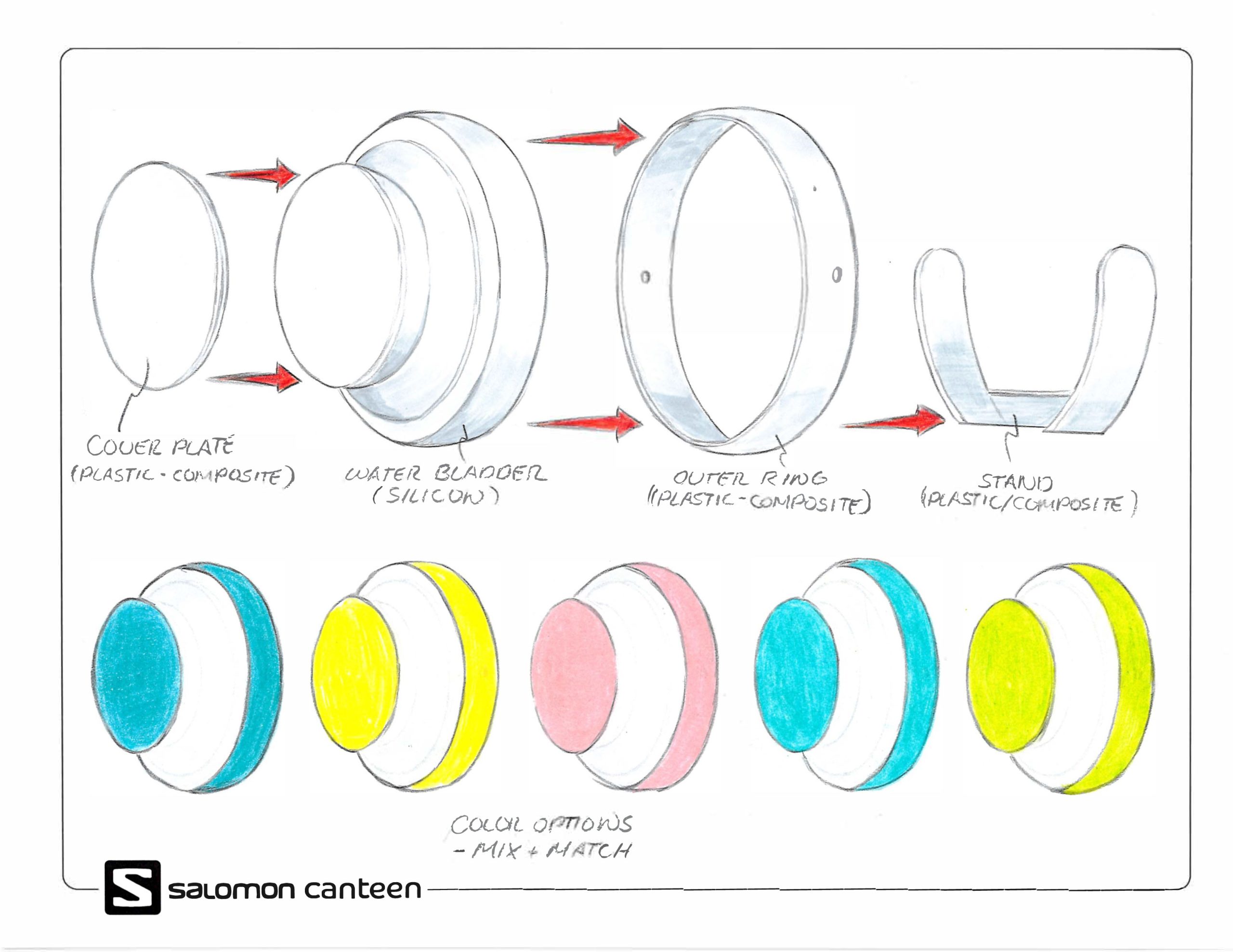 The canteen concept is developed through a modular, user-centered design process that emphasizes durability, portability, and customization. Initial exploration focuses on components like caps, grip textures, and color options to define both function and visual identity. The design evolves into a compact, ergonomic form featuring a kickstand for stability and an expandable silicone bladder for flexible capacity. Built from interchangeable parts, the cover, bladder, outer ring, and stand, the system supports efficient manufacturing and personalization, resulting in a lightweight, performance-driven solution aligned with Salomon’s brand.